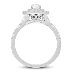 Collection comes this enchanting women’s engagement ring. The ring features a stunning pear-shaped diamond at its center, haloed by two rows of brilliant round diamonds. Additional round diamonds grace each side of the band, bringing the total diamond weight to 1 3/8 carats.The ring is fashioned in 14K white gold.