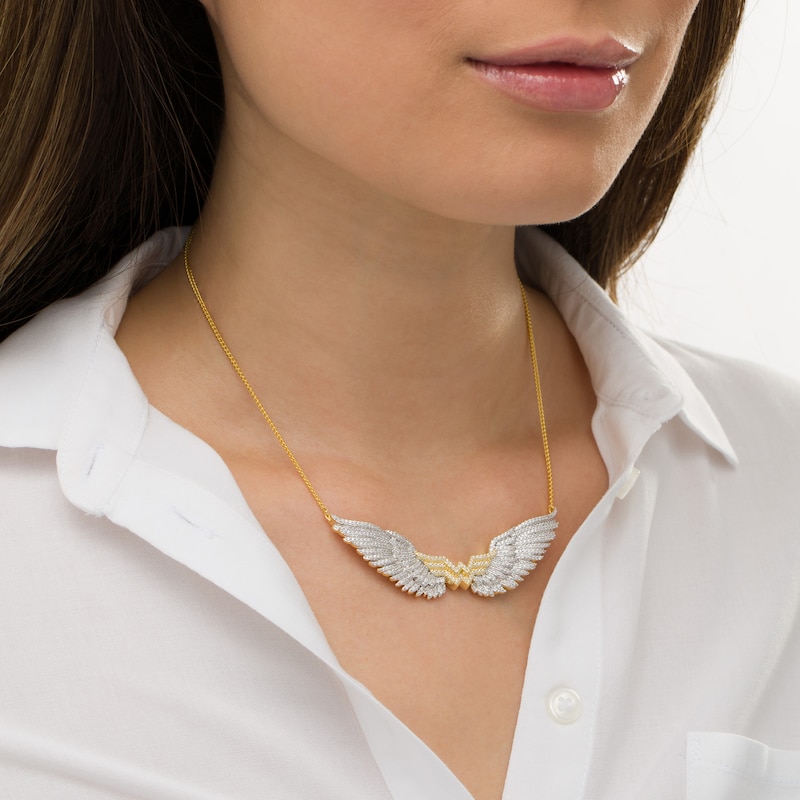 Soar to new heights in style with this show-stopping diamond wing necklace. Crafted in warm 10K gold, this dazzling design features layered feathers decked with shimmering diamonds. At the center, the logo sparkles with diamond-studded detail. Spectacular with 2 cts. t.w. of diamonds and a brilliant buffed luster, this 2.9-inch look suspends centered along a 15.1-inch wheat chain that secures with a lobster claw clasp. This exclusive fine jewelry collection inspires you to wear your strength, confidence and power.